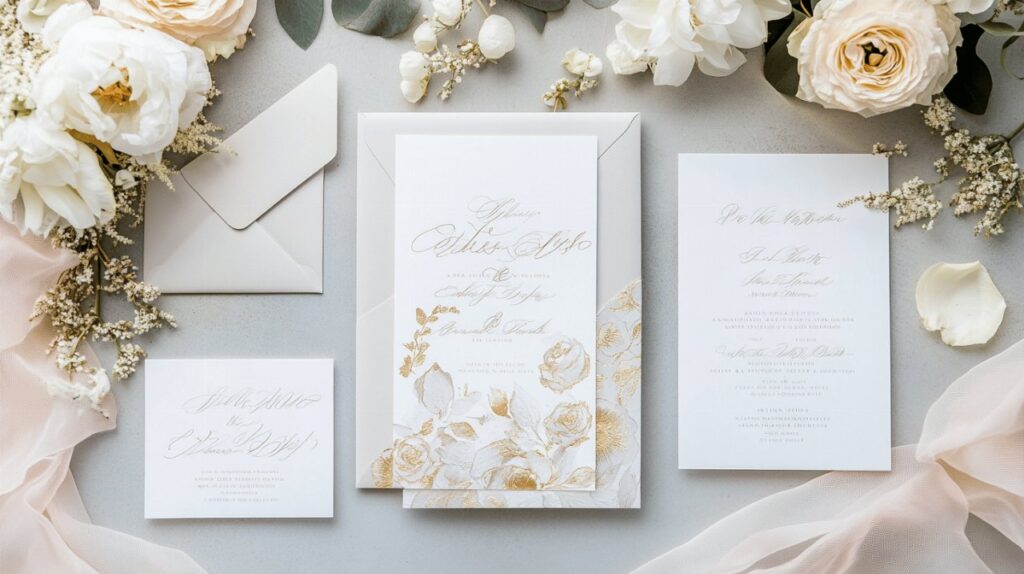 Les motifs géométriques subtils apportent une dimension contemporaine sans surcharger le design. Des lignes fines, des formes abstraites ou des cadres minimalistes structurent l’information tout en créant un visuel mémorable. Cette tendance, plébiscitée par les experts de Les Echos Le Parisien Services, séduit les couples qui recherchent un équilibre parfait entre simplicité et raffinement.